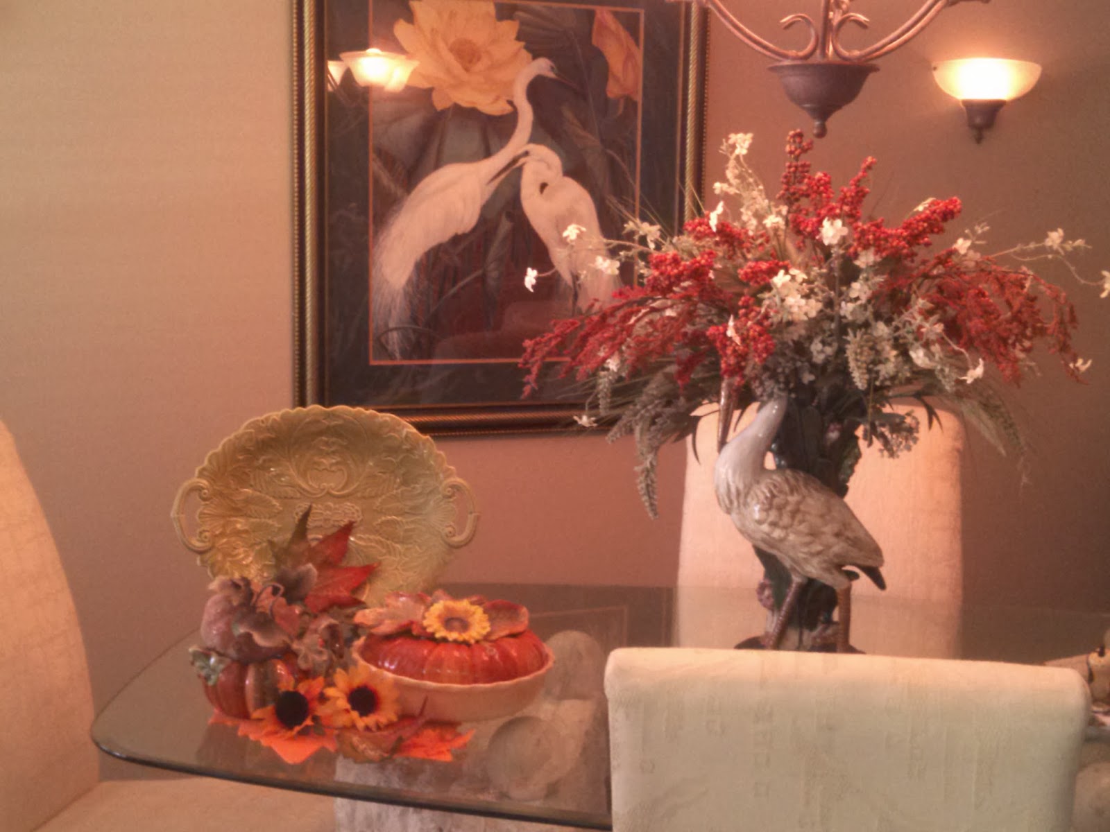 Dining Room is all ready for Fall too, gave my Egret a new fall Do, and added a small table scape at the end of the Dinning table.